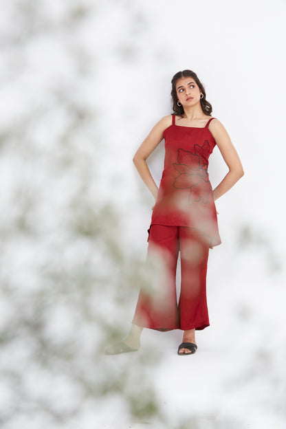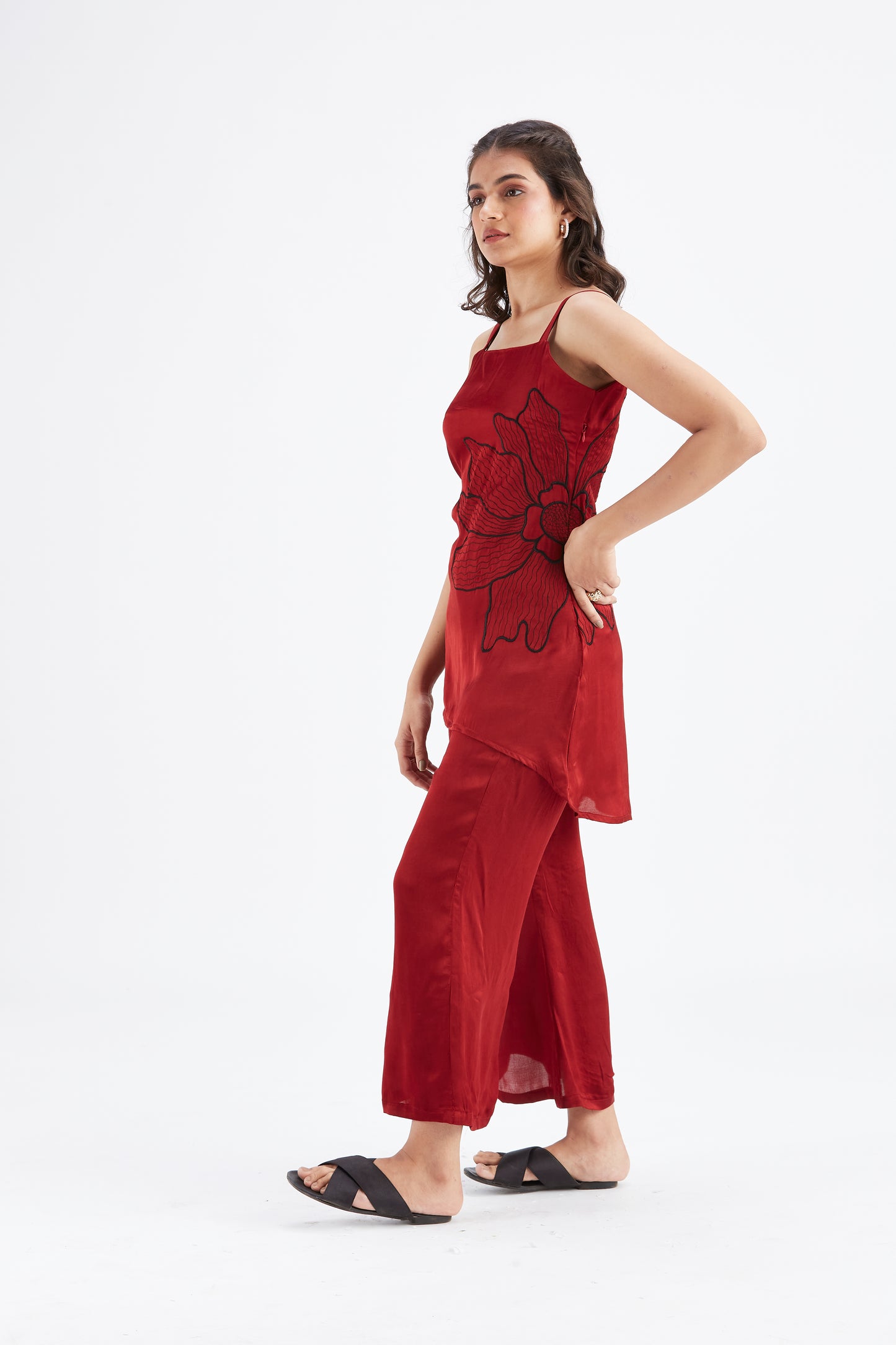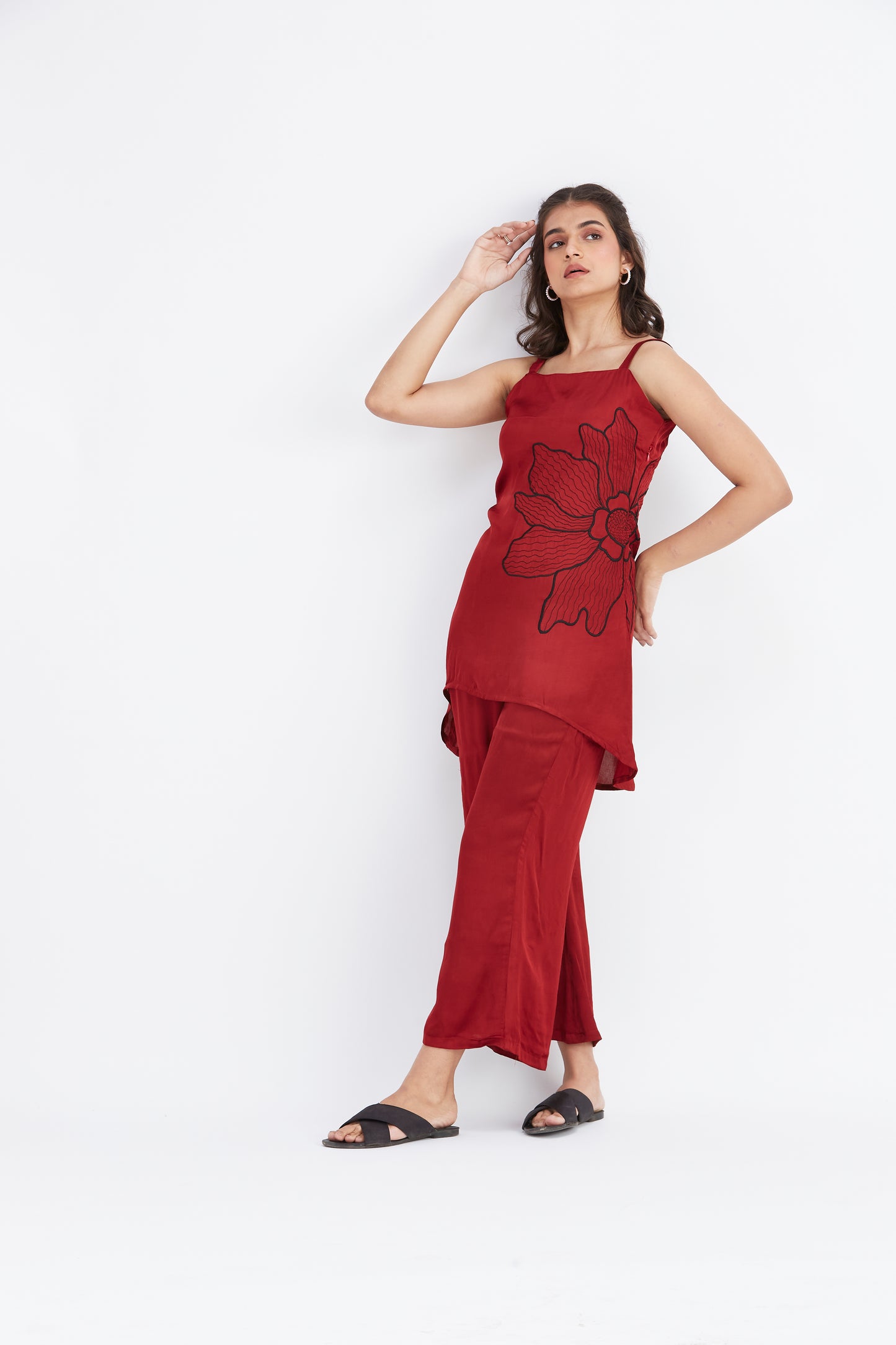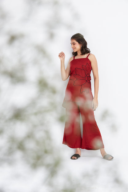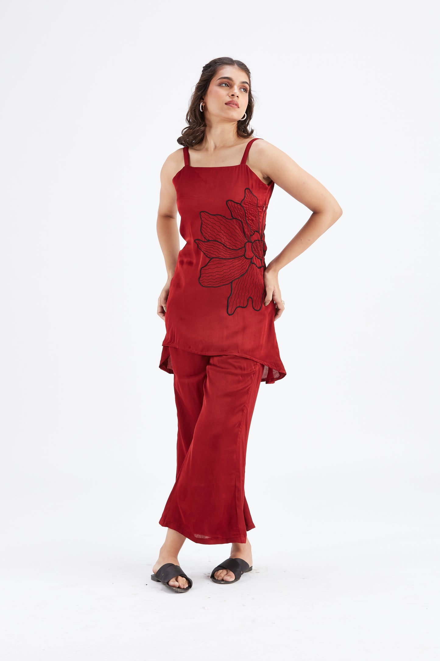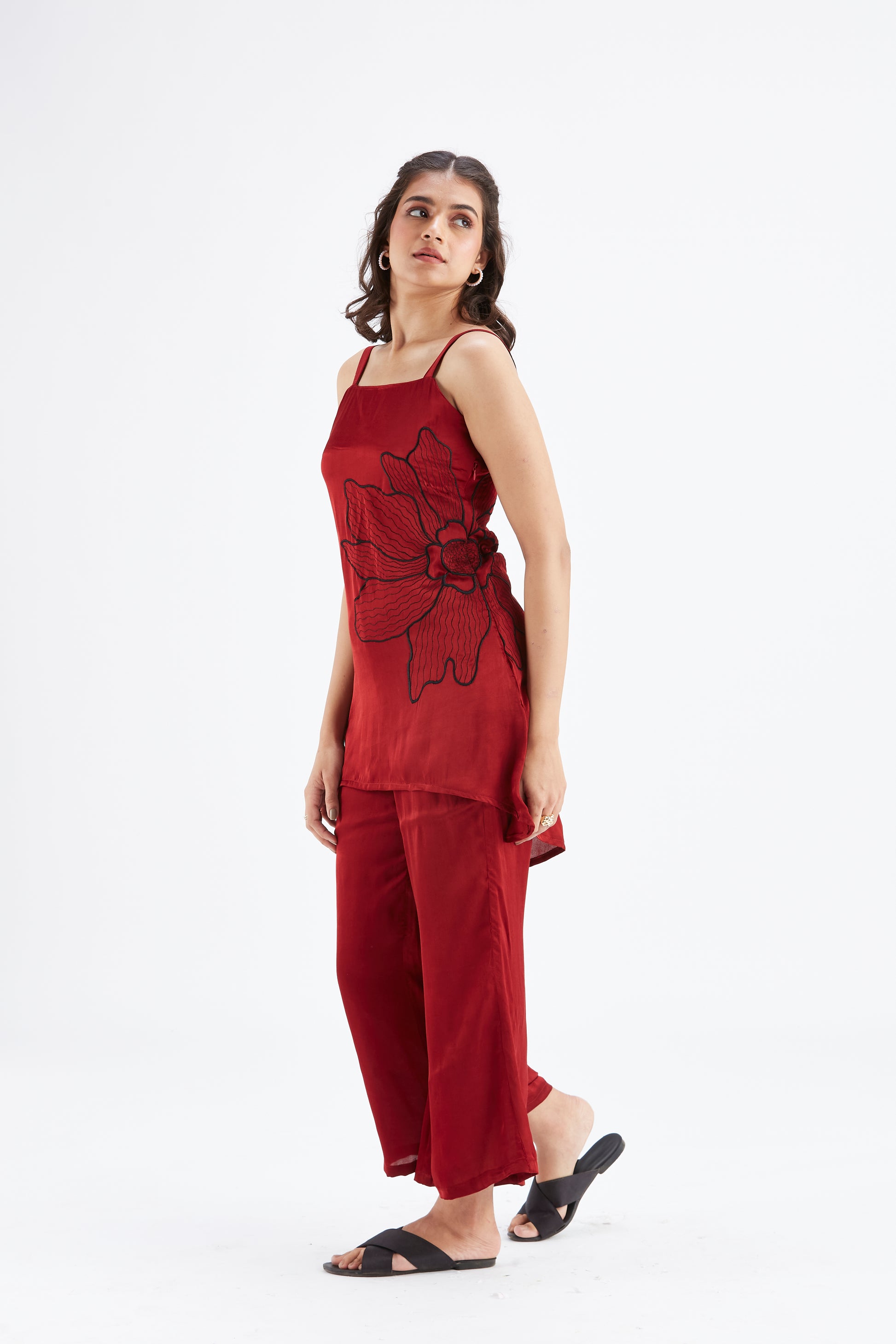 The Alina Red Co-ord Set redefines modern sophistication with an artisanal twist. The top, featuring delicate straps and a high-low hem, creates a flattering silhouette that exudes effortless elegance. The rich, luxurious red modal fabric adds depth and warmth to the design, while the striking embroidery on the side elevates the set with intricate, hand-crafted detail.