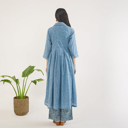 As soft as a drizzle on a quiet morning, this co-ord set is crafted from airy cotton mul-mul, designed to flow effortlessly with every movement. The top features delicate pintucks on the bodice, reminiscent of ripples on a rain-kissed lake, and a fluid button-down silhouette that echoes the gentle rhythm of falling raindrops. A refined Peter Pan collar, accentuated with white tape detailing, adds a touch of charm, while the quarter-length raglan sleeves with tonal stitching offer an artisanal finish. Paired with wide-legged pants in a complementary resist print, this ensemble is a timeless ode to nature’s quiet elegance.