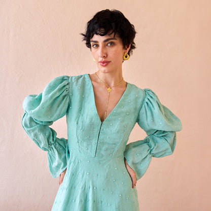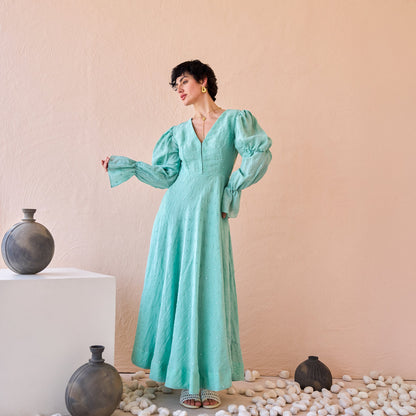 Crafted in a soothing pastel aqua, this maxi-length dress blends structure with softness. It features a flattering V-neckline with subtle herringbone stitch detailing at the cleavage, adding texture and finesse.The standout detail? Two-tiered full-length puffed sleeves that bring gentle volume and a romantic silhouette. The stylised back and center-back zipper offer a clean, modern finish—designed for both comfort and impact.